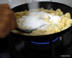 - Stir in medium flame for 4-5 minutes or still the kesari forms as a whole mass(doesn't stick to the pan at all).